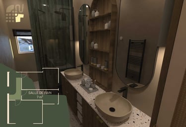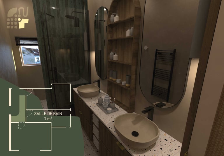 Création d’une salle de bain en couloir stylée et cosy, aux nuances bois, terracotta et zellige vert.