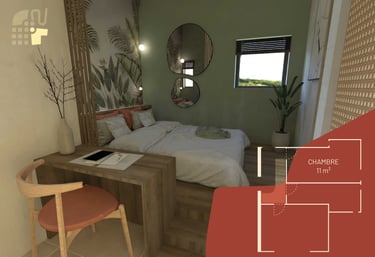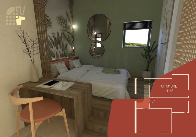 Aménagement d'une petite chambre dans le sud de la France vu sur le jardin.