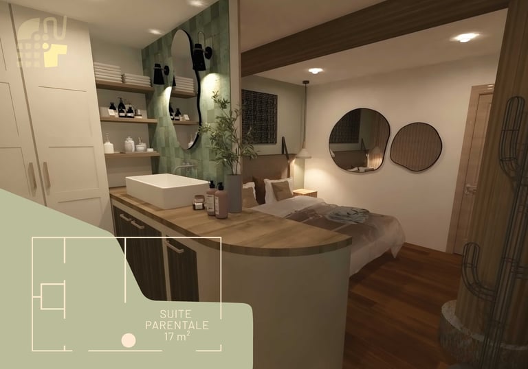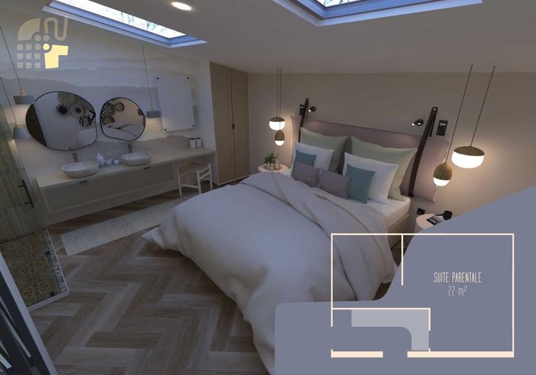 Aménagement d’une suite parentale sous les combles, cosy et moderne.